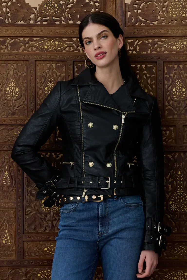 Chaqueta de pu forrada con cierre y cinturón en la cadera de Indiastyle