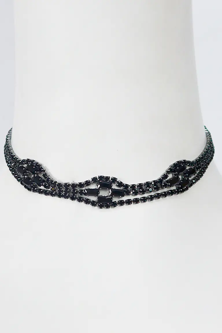 Elegante choker ajustable con diseño de tres óvalos y piedras cuadradas en color negro. Accesorio perfecto para completar cualquier look casual o formal. Combina fácilmente con diferentes estilos de ropa. Añade un toque de sofisticación a tu atuendo.