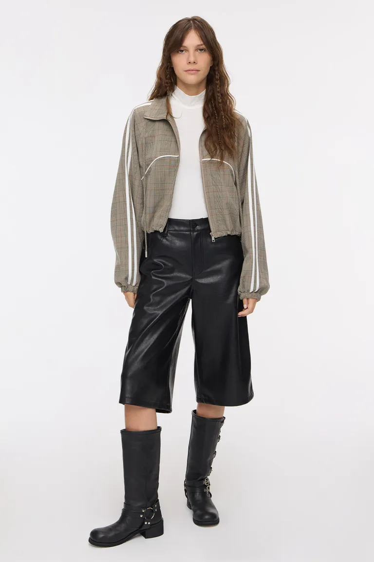 Bermuda de corte amplio diseñada con presillas en la cintura y cierre de botón metálico. Presenta un diseño versátil ideal para combinar en diversos outfits diarios, ofreciendo comodidad y un estilo moderno con su silueta de largo medio.