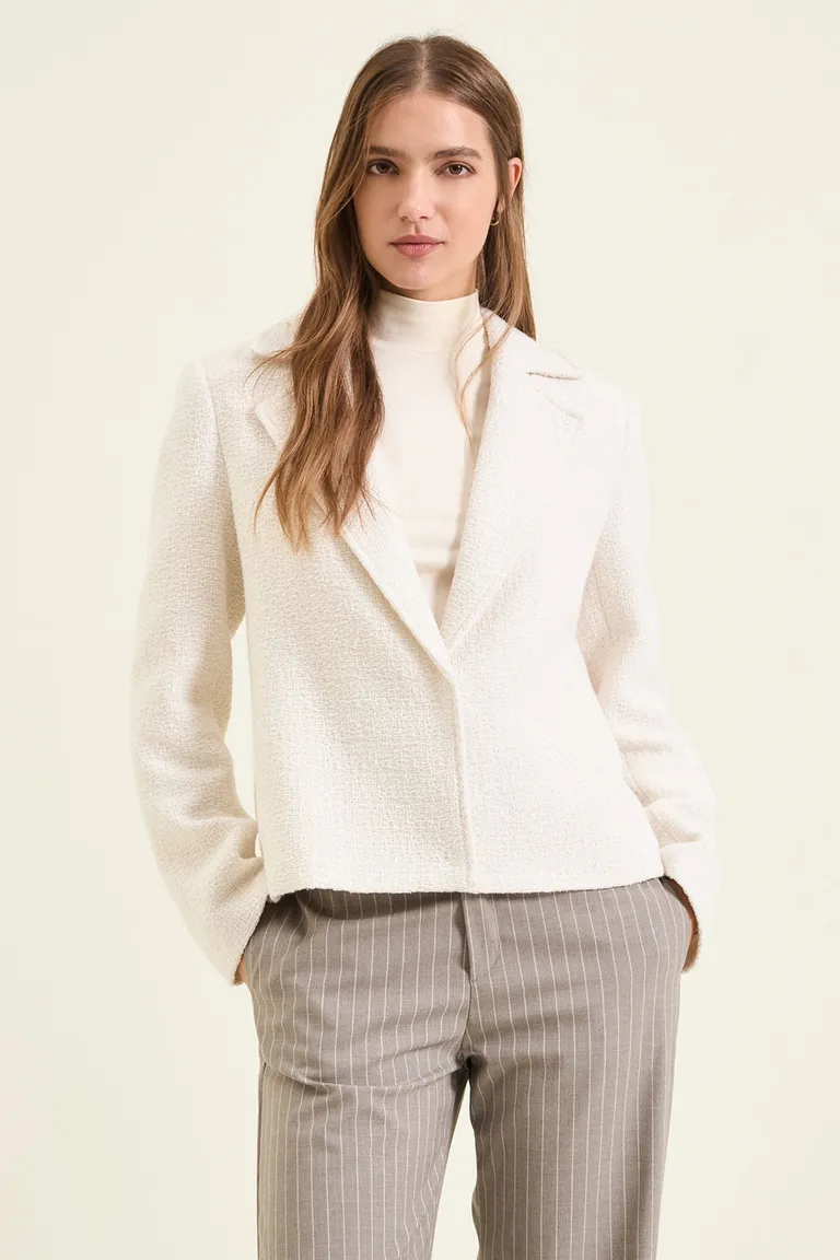 Blazer de corte estructurado con solapas clásicas y cierre frontal oculto. Esta prenda presenta una textura característica y detalles de diseño limpio en la parte delantera. Ideal para completar looks formales o casuales de oficina. Incluye forrería interna para mayor estructura y comodidad.