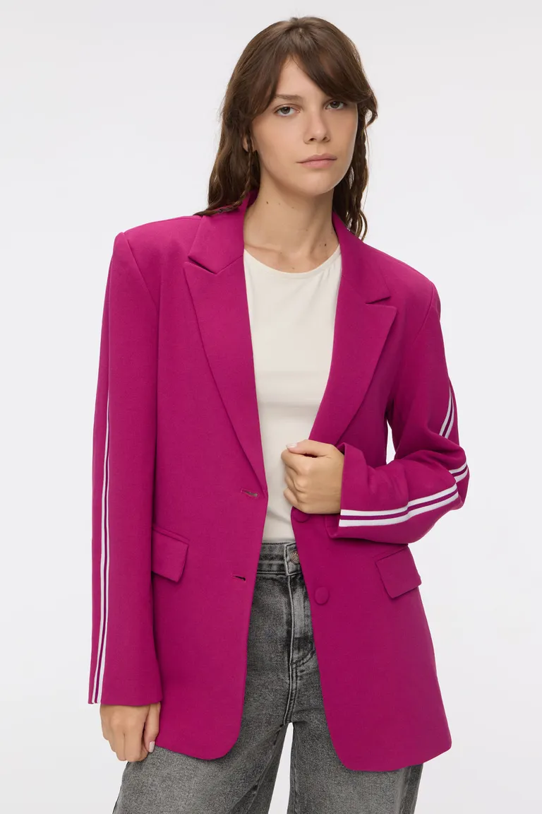 Blazer de diseño estructurado con solapas clásicas y cierre frontal mediante botones. Esta prenda incorpora un detalle distintivo de bandas laterales estilo deportivo a lo largo de las mangas, aportando un toque contemporáneo y versátil. Cuenta con bolsillos con tapa en los laterales y un corte moderno ideal para complementar conjuntos urbanos o casuales. Una pieza esencial de diseño cuidado que equilibra la elegancia del corte sastrero con un estilo dinámico y actual.