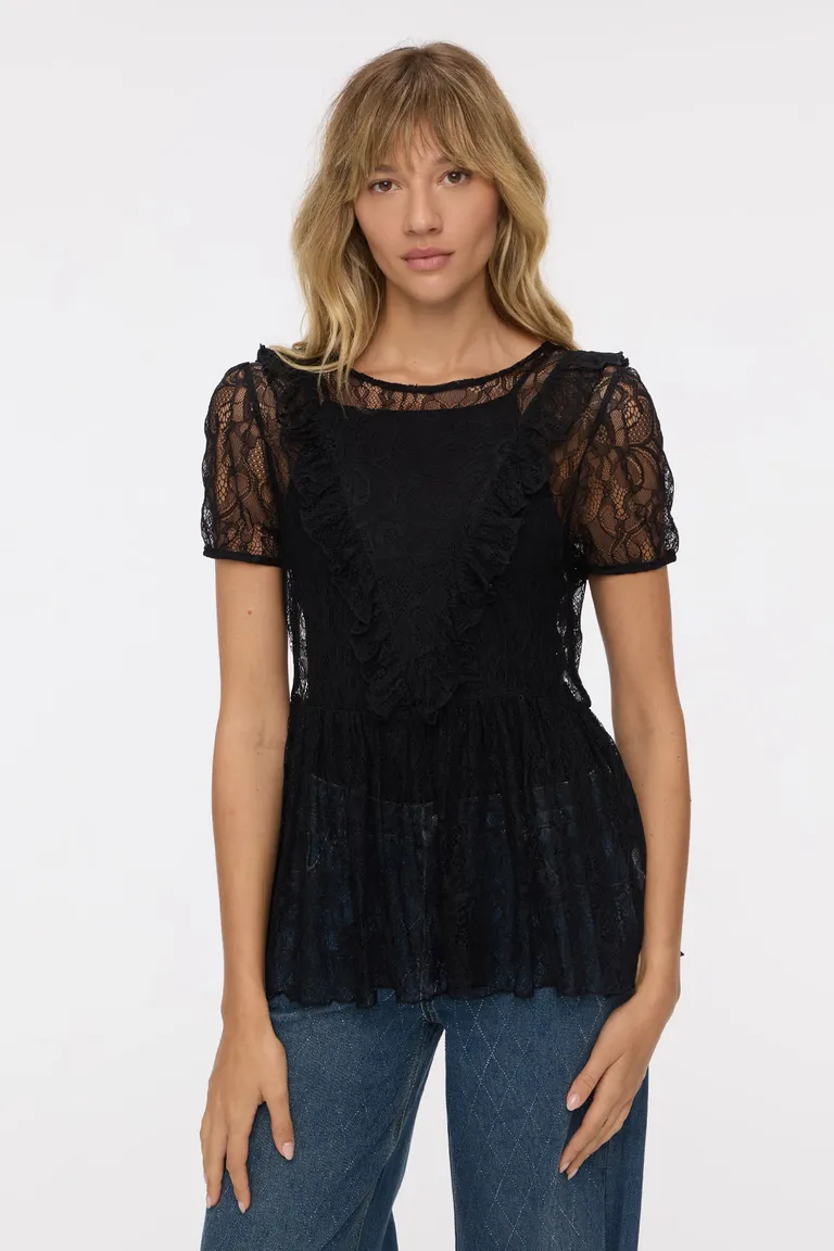 Blusa femenina confeccionada en encaje con diseño delicado. Presenta un clásico escote redondo y detalle de volados que recorren el frente y las mangas cortas, aportando textura y movimiento a la prenda. Una pieza versátil y elegante para completar tus conjuntos diarios.