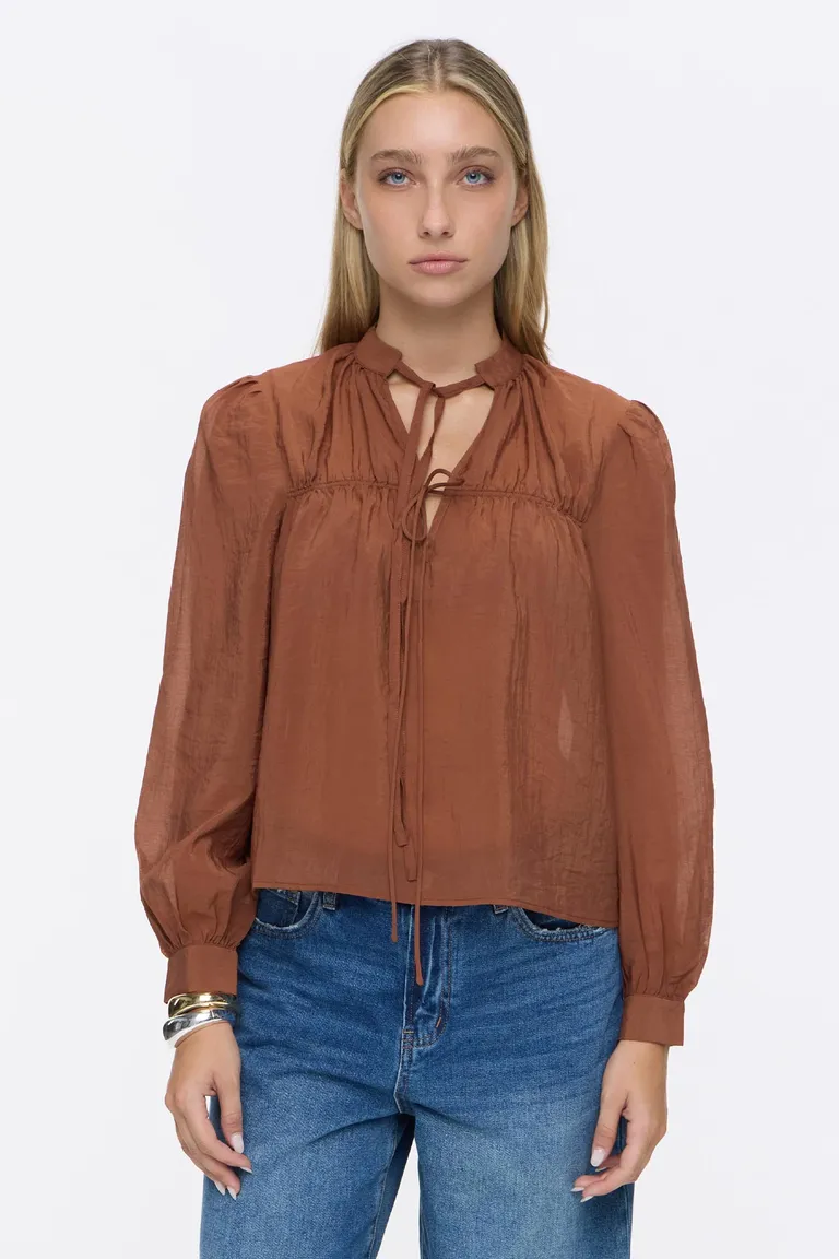 Blusa de mangas largas con detalle de jareta regulable en el frente y escote con tiras para atar. Presenta un diseño de calce holgado con puños ajustados y cuello alto, ideal para combinar en cualquier ocasión cotidiana. Una prenda versátil y cómoda para sumar al guardarropa de temporada.