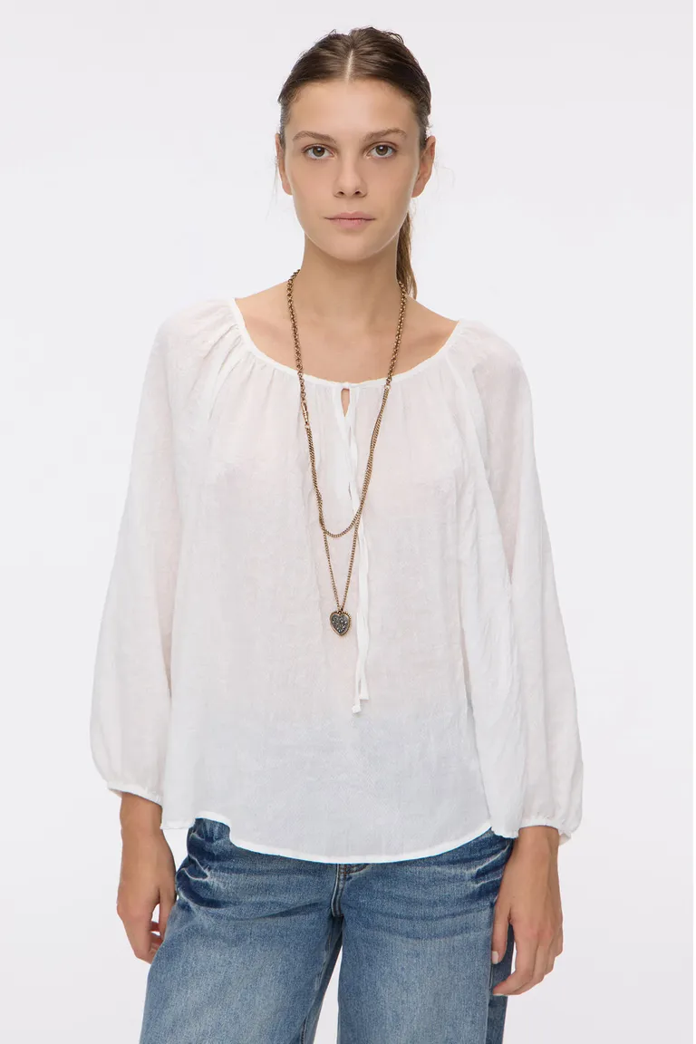 Blusa de calce holgado con frunces en el escote y detalle de lazo para atar. Presenta una abertura frontal y mangas con puños elásticos que aportan comodidad y un toque romántico a cualquier conjunto. Ideal para combinar con diversas prendas inferiores en looks diarios.