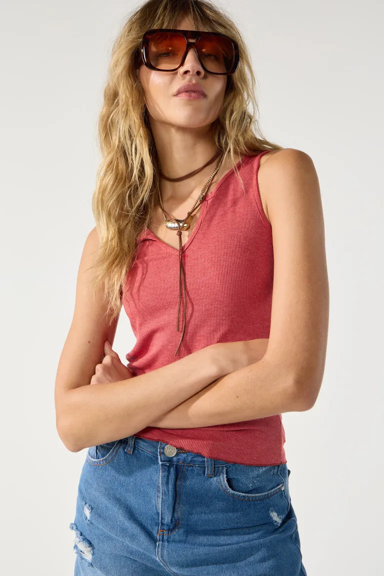 Blusa roja contemporánea con escote en V y sisas con vivos para una apariencia elegante de Cuesta Blanca