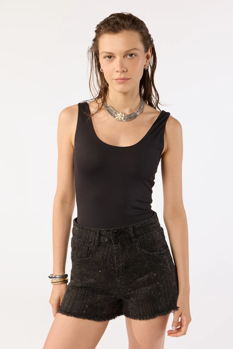 Body musculosa con escote redondeado y diseño clásico. Esta prenda versátil se adapta al cuerpo proporcionando comodidad y estilo. Ideal para combinar con diversas prendas inferiores gracias a su calce entallado y espalda cavada, convirtiéndose en un básico esencial para el guardarropa femenino.