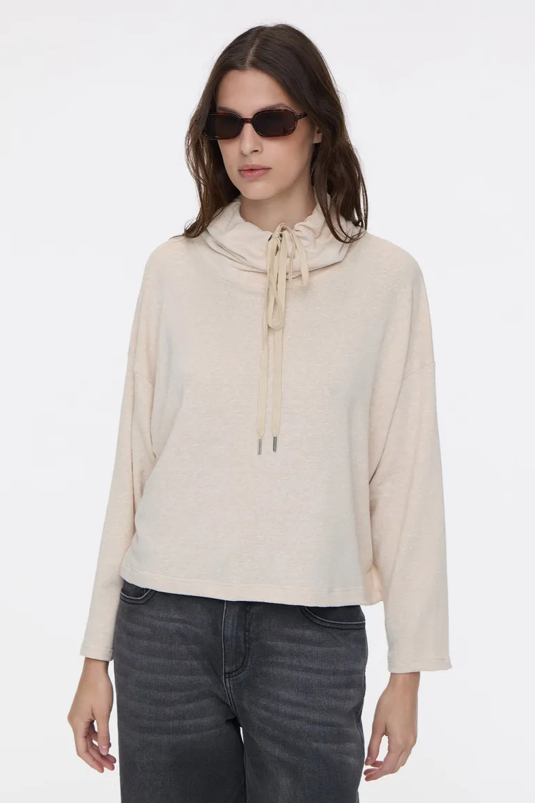 Buzo de cuello alto con cordón ajustable. Diseño de corte holgado con mangas largas, ideal para combinar en outfits diarios. Su estilo versátil y relajado lo convierte en una prenda esencial para el uso cotidiano en cualquier temporada del año.