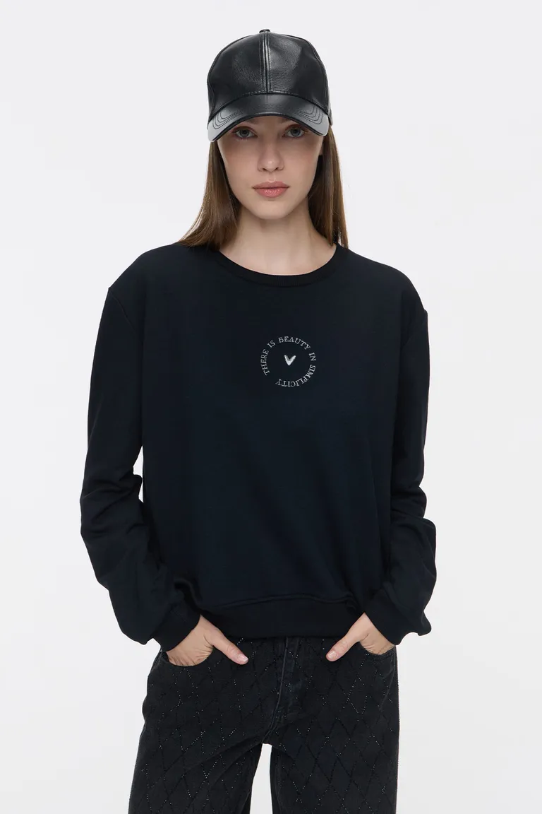 Buzo de cuello redondo con calce cómodo y versátil. Presenta un detalle de bordado minimalista en el centro del pecho que le aporta un toque distintivo. Una prenda básica ideal para completar outfits casuales de uso diario en cualquier temporada.