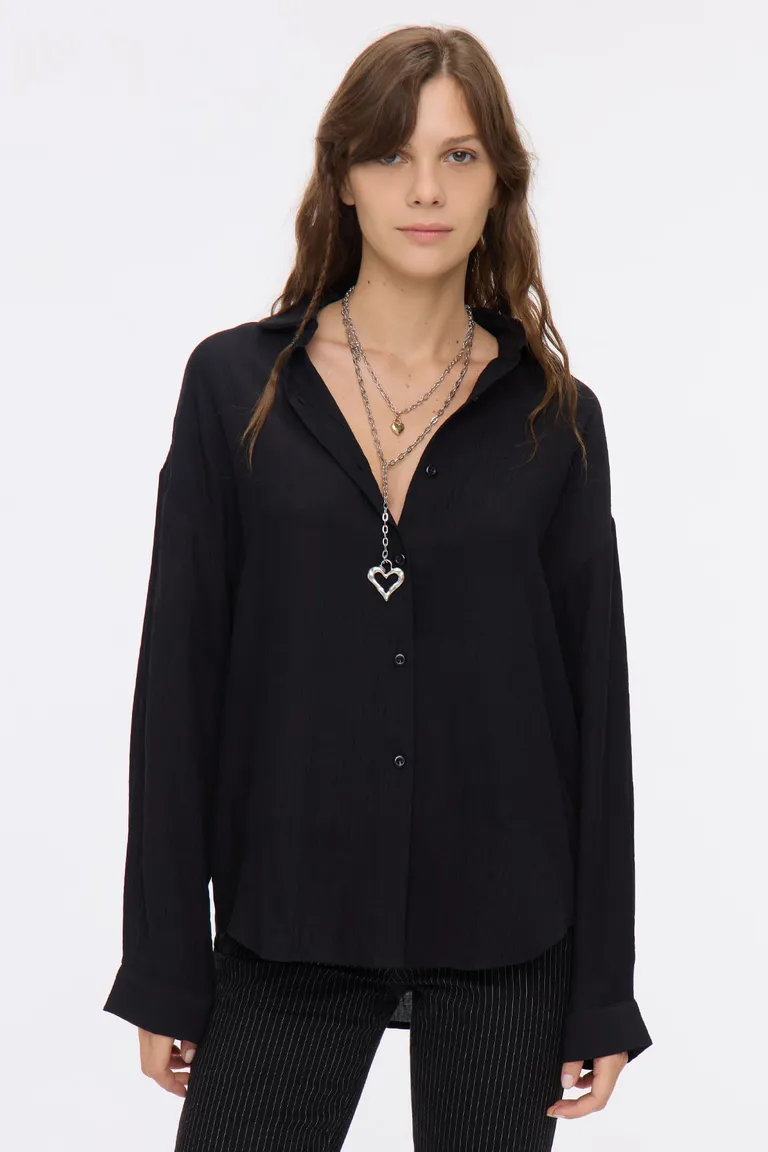 Camisa de corte clásico con cuello camisero, cierre frontal abotonado y mangas largas con puños. Presenta un diseño versátil de calce relajado con detalle de canesú en la espalda y textura sutilmente plisada, ideal para complementar distintos looks diarios con elegancia.