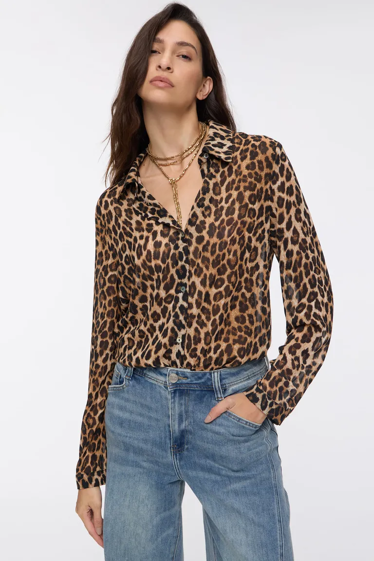 Camisa de corte clásico con cierre frontal de botones y cuello camisero. Presenta un diseño de motivo animal print, ideal para combinar en diversos outfits. Su calce fluido ofrece comodidad para el uso diario, permitiendo versatilidad tanto en looks formales como casuales.