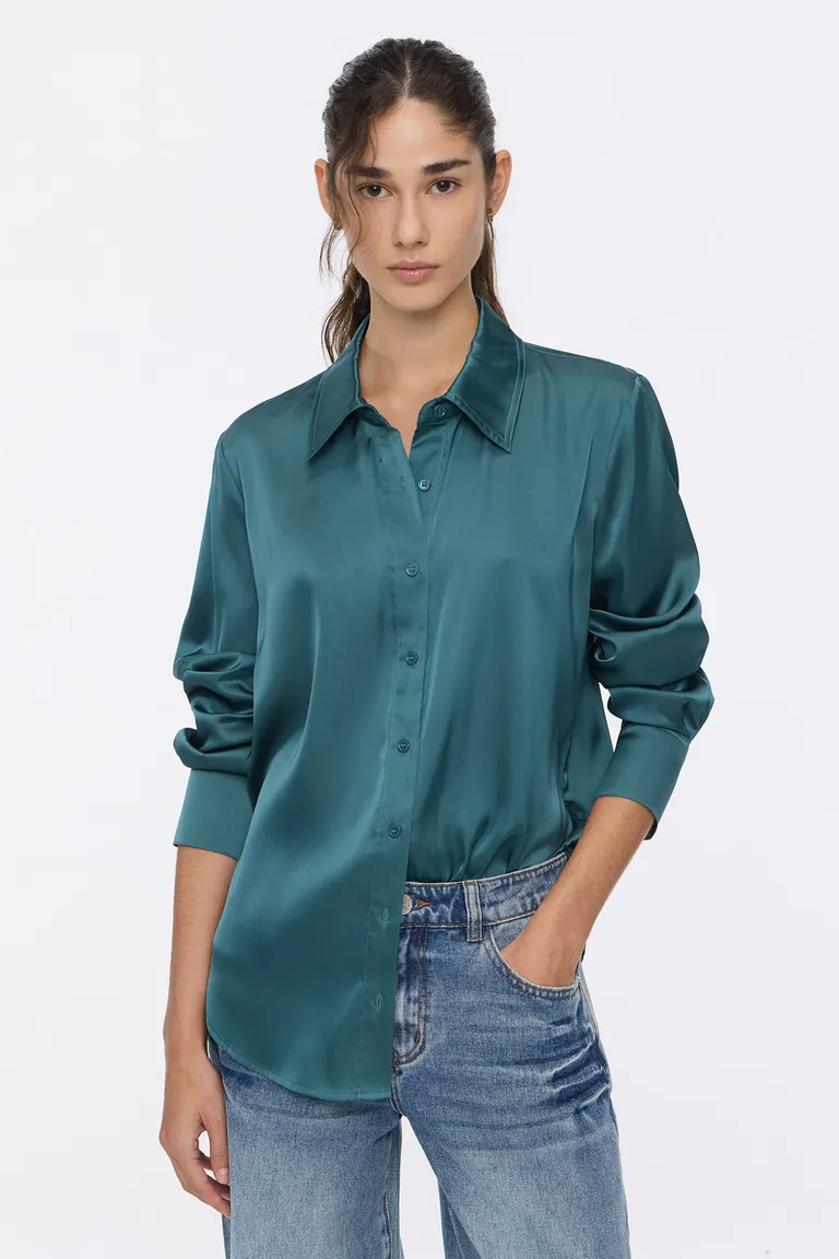Camisa de mujer con mangas largas, diseño de cuello clásico y cierre frontal por botones. Presenta un corte con ruedo redondo y detalle de pinzas en los puños, ofreciendo una caída fluida y un acabado suave al tacto. Ideal para sumar versatilidad a cualquier conjunto diario con un toque sofisticado.