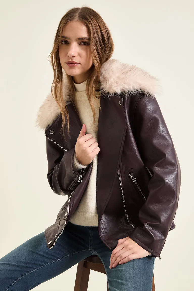 Campera estilo biker de calce holgado con cuello de piel sintética desmontable. Presenta cierre frontal, bolsillos funcionales y detalles de broches metálicos. Una opción versátil y moderna para combinar en looks diarios durante la temporada de frío, aportando abrigo y estilo a cualquier conjunto.