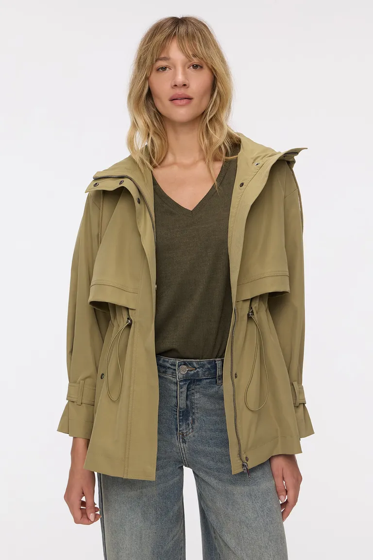 Campera a la cadera con capucha, diseño con jareta en cintura, cordón elastizado y tancas ajustables. Presenta pechera y espaldín con detalle suelto. Su acceso se realiza mediante cierre y broches a presión, complementada con ajuste mediante botones snaps en los puños para mayor versatilidad.