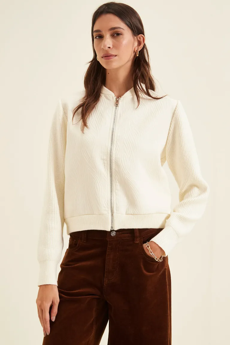 Campera de diseño versátil con cierre metálico frontal, ideal para completar tus conjuntos diarios. Presenta un diseño funcional con mangas largas y terminaciones ajustadas en puños y cintura, brindando una silueta cómoda y moderna. Una pieza práctica para integrar en diversas capas durante el entretiempo.