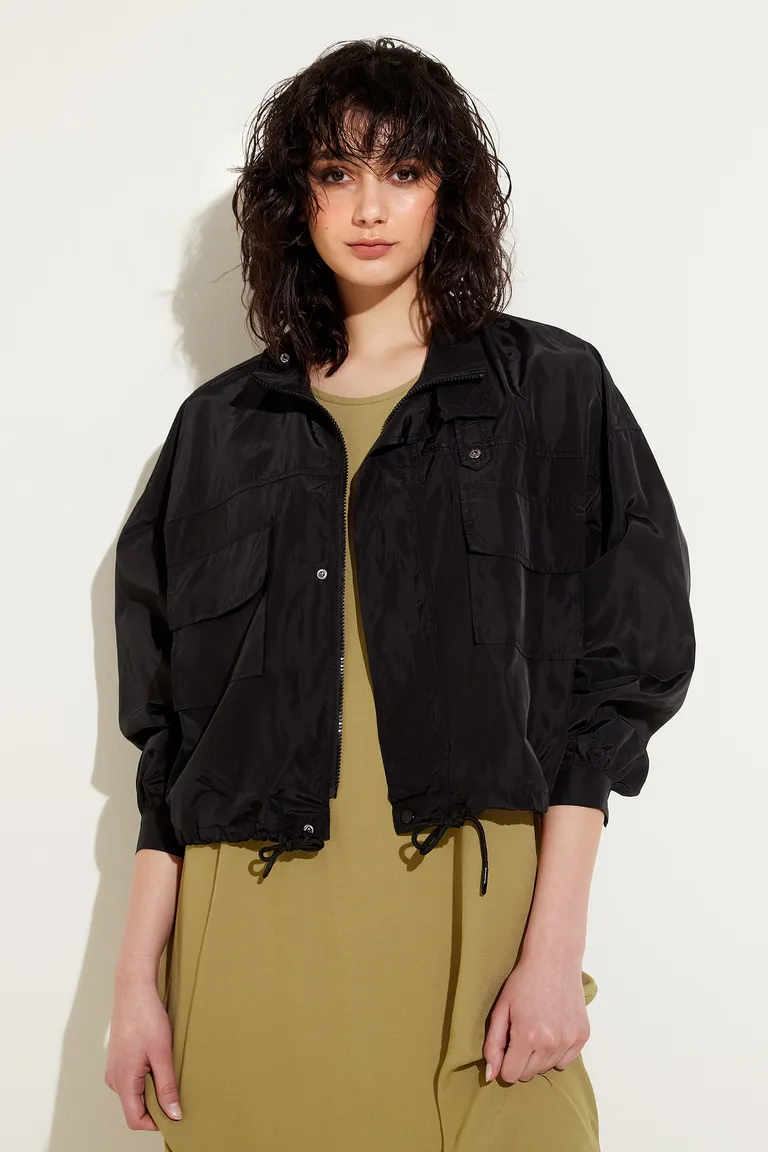 Campera estilo utilitario de calce holgado con hombros caídos, mangas largas con puños ajustables y bolsillos delanteros. Presenta un diseño con cuello alto, cierre frontal oculto y cordón de ajuste en el ruedo. Una prenda versátil ideal para complementar outfits urbanos de media estación.