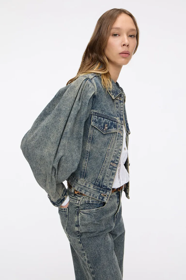 Campera corta con diseño de mangas abullonadas y proceso de lavado localizado. Presenta un corte clásico a la altura de la cadera con cierre frontal por botones y bolsillos funcionales. Ideal para complementar looks casuales de media estación con un toque distintivo.