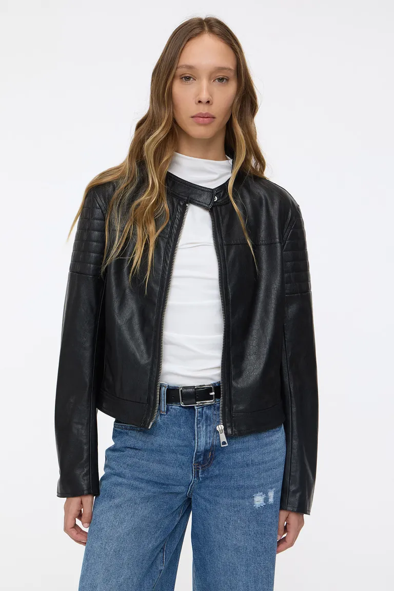 Campera estilo biker con cuello mao y cierre frontal. Presenta detalles de costuras matelaseadas en los hombros y un diseño estructurado con cortes en el frente que brindan un calce moderno y versátil para completar cualquier conjunto urbano.