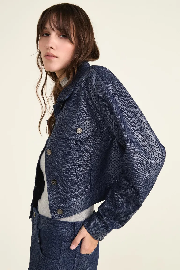 Campera de corte clásico con diseño de textura animal print. Presenta cierre frontal con botones metálicos y bolsillos delanteros, ofreciendo un estilo moderno y versátil para complementar outfits urbanos de media estación.