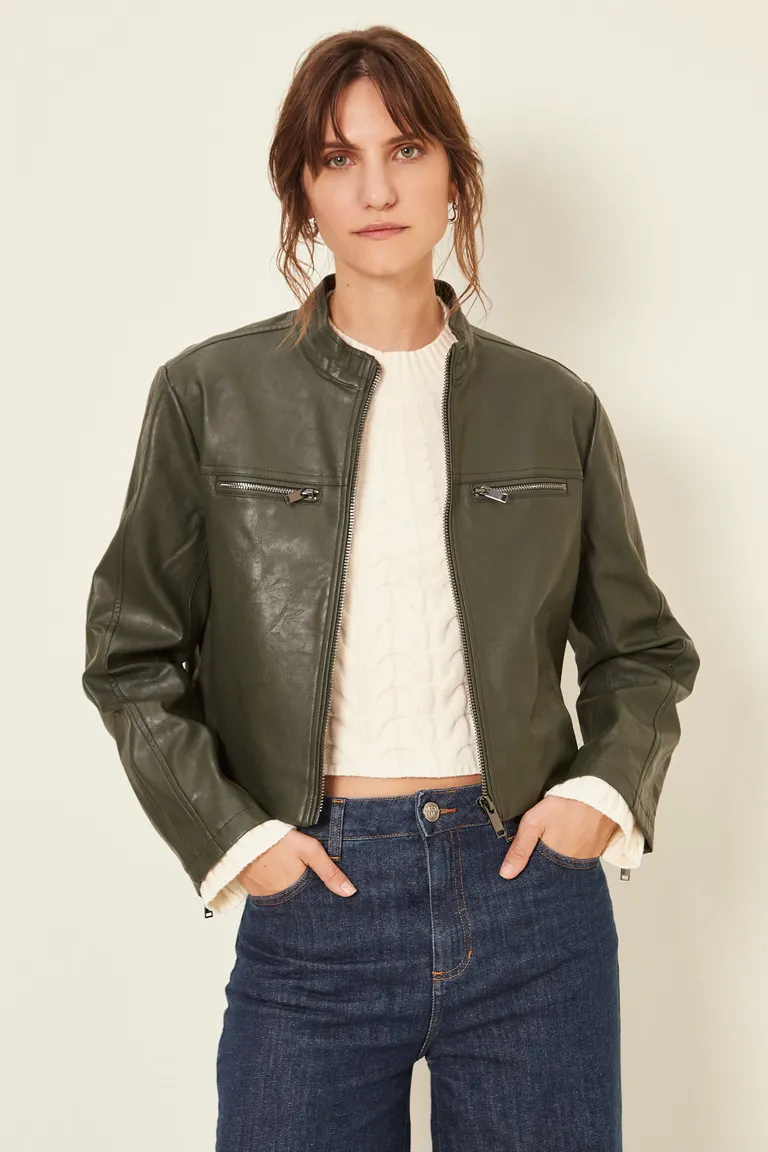 Campera corta con cuello mao y cierre frontal metálico. Presenta mangas largas, bolsillos funcionales y detalle de cierres en la zona del pecho. Una prenda versátil y cómoda ideal para completar cualquier outfit de temporada con un estilo moderno y funcional.