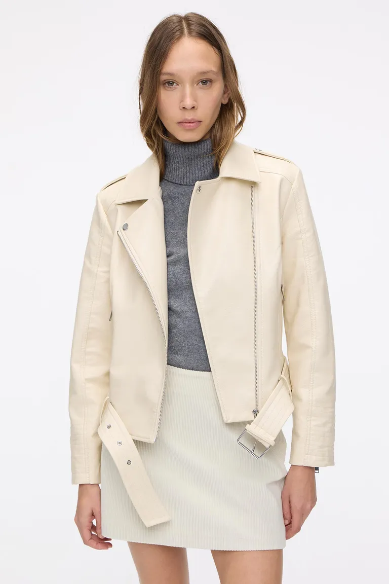 Campera tipo biker con cierre frontal metálico y diseño clásico con solapas. Cuenta con detalles de charreteras en los hombros, cierres en bolsillos y un cinturón ajustable con hebilla metálica en la cintura para definir la silueta. Ideal para complementar cualquier conjunto de media estación con un toque moderno y urbano.