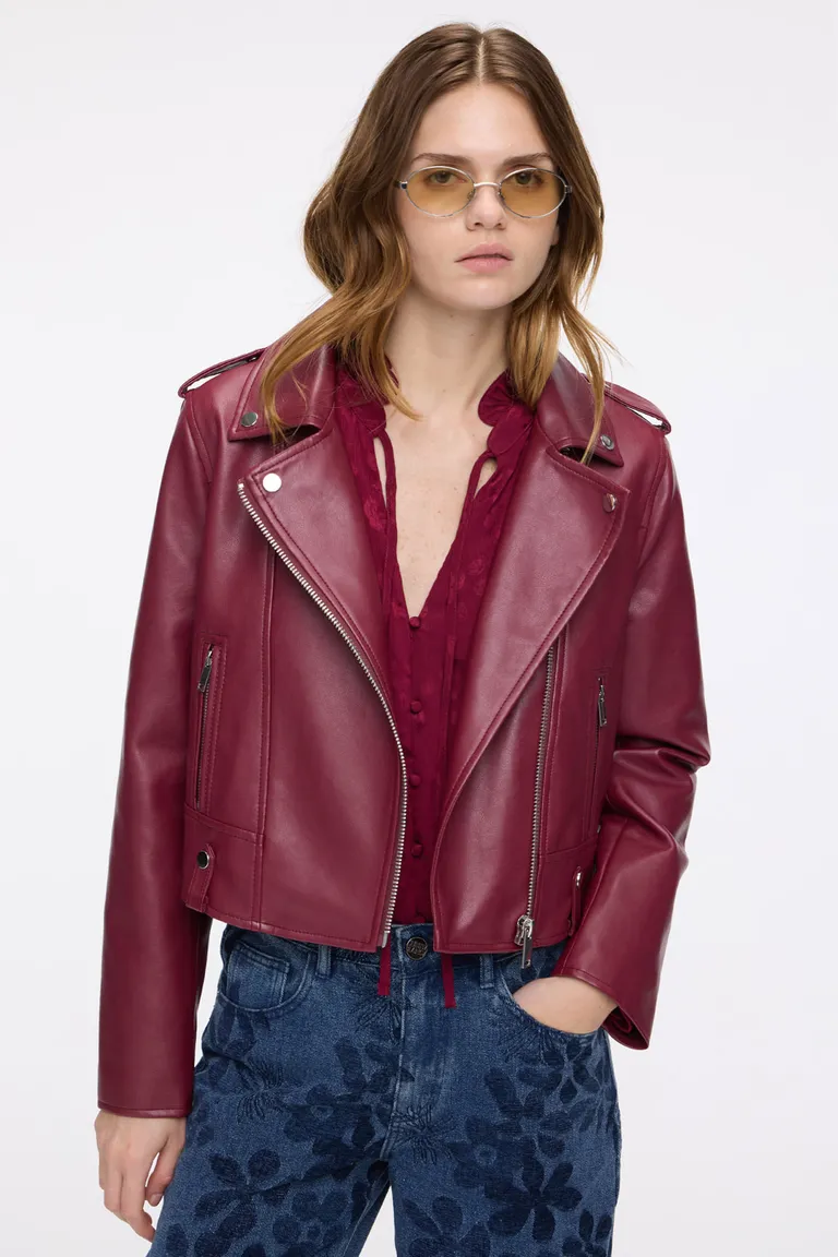 Campera estilo biker con cierre metálico frontal y bolsillos, presenta recortes en el frente y mangas. Incluye detalles de presillas, charreteras y cuello con botones a presión metálicos para un diseño clásico y versátil. Ideal para complementar outfits urbanos con un toque distintivo.