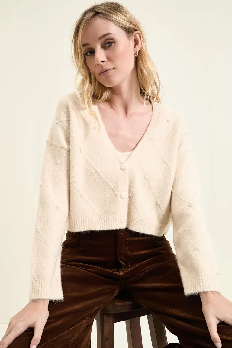 Cardigan con escote en V y diseño de rombos en relieve. Cuenta con cierre frontal de botones y detalles de perlas en el frente y las mangas. Presenta terminaciones en punto rib en puños y cintura, brindando un ajuste cómodo y versátil para diversas ocasiones.