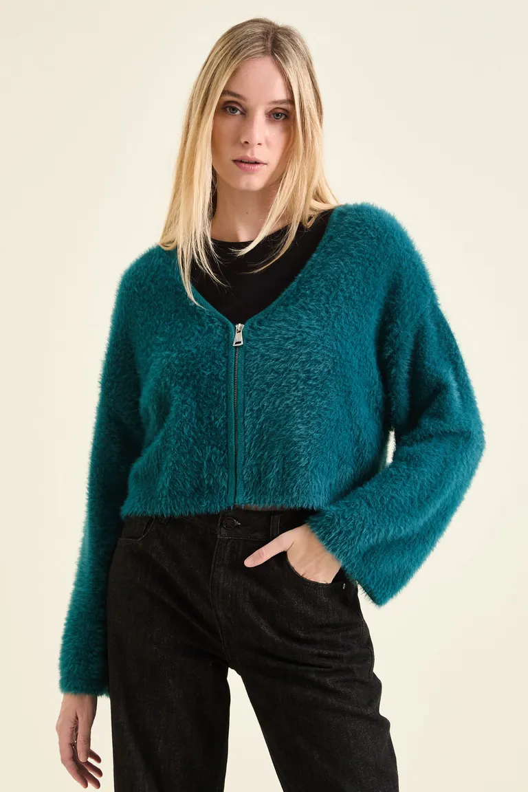 Cardigan de corte corto con cierre metálico central y escote en V. Presenta un acabado texturizado con efecto pelo y terminaciones en punto rib en puños, cuello y cintura, ideal para completar outfits diarios con un toque de estilo y abrigo.