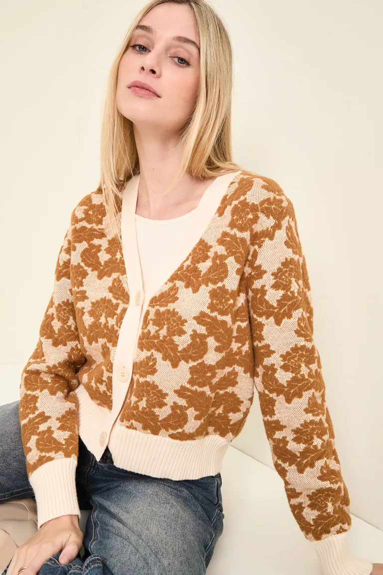 Cardigan de corte corto con escote en V y diseño tejido de jacquard. Presenta puños y cintura en punto rib, con un acceso frontal mediante botones. Una prenda ideal para combinar en looks casuales y versátiles de media estación, aportando textura y calidez al outfit diario.