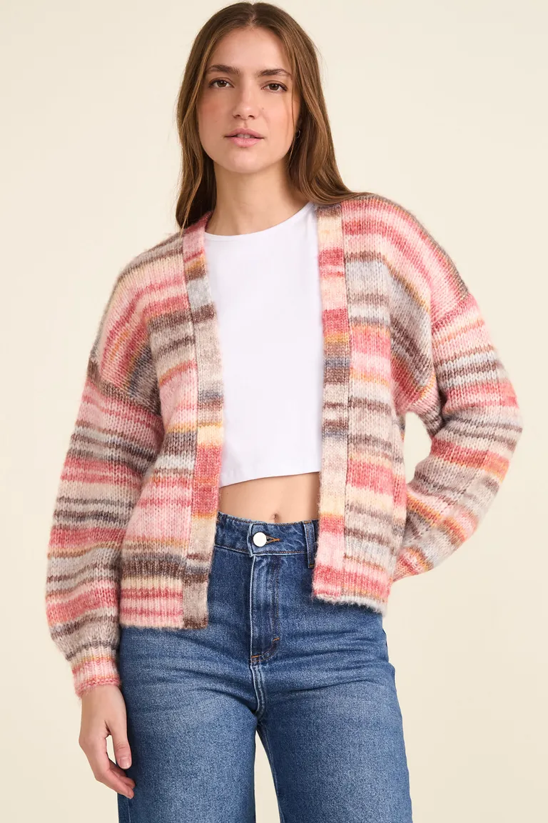 Cardigan abierto con diseño de rayas multicolor y mangas con detalle de frunces en los puños. Presenta terminaciones en punto rib en cuello, cintura y puños, brindando una caída cómoda y versátil. Una prenda ideal para combinar en capas y completar conjuntos diarios con un toque de color y textura.
