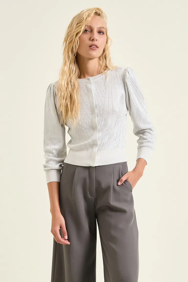 Cardigan de tejido con escote redondo y mangas balloon. Presenta un diseño con apliques decorativos en el frente y las mangas, complementado con puños y cintura en tejido elástico. El acceso se realiza mediante broches ocultos. Una prenda versátil y distinguida para sumar textura y detalle a tus outfits cotidianos o eventos especiales.