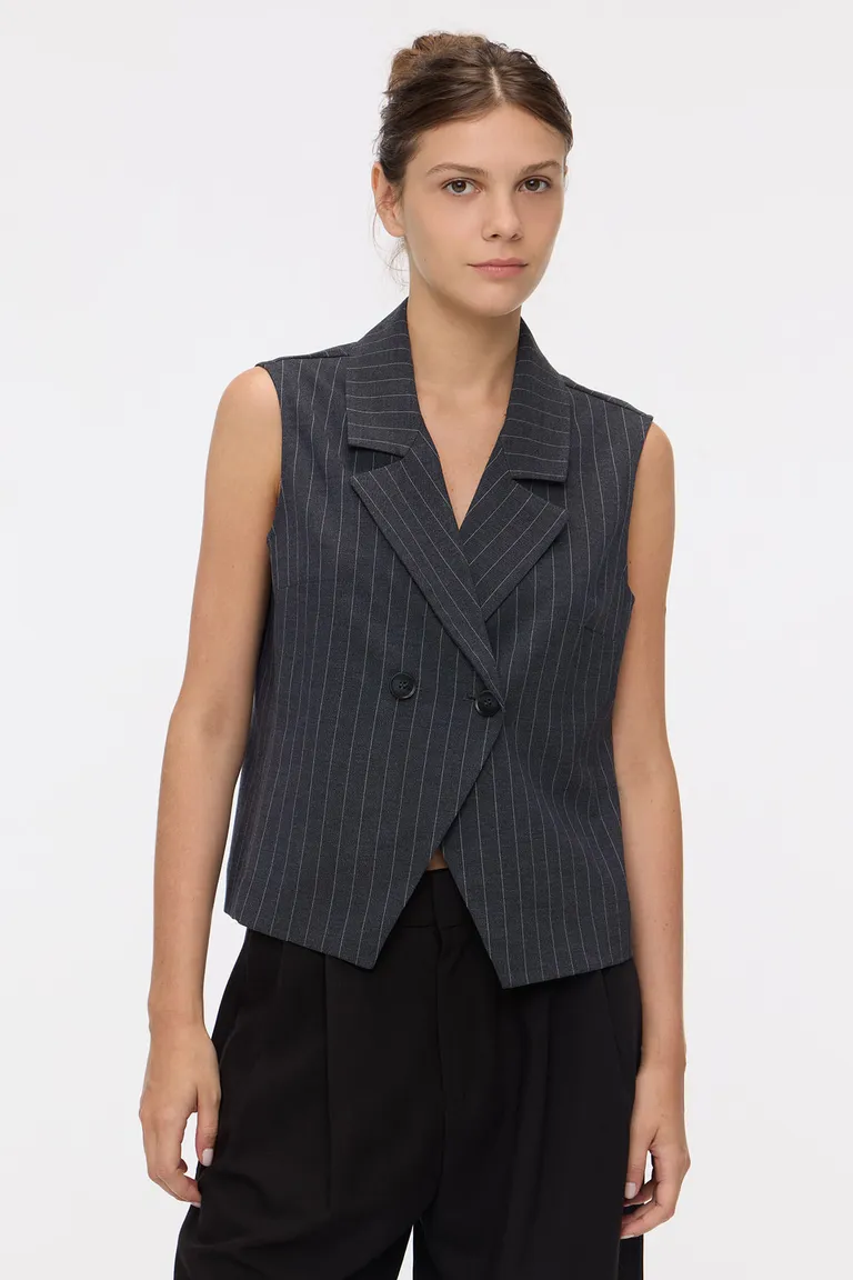 Chaleco sastrero de corte clásico con diseño a rayas verticales y cierre frontal cruzado con botones. Presenta un estilo formal y elegante, ideal para completar equipos de oficina o eventos especiales. Su diseño sin mangas ofrece una silueta estructurada y versátil para combinar con diversas prendas inferiores.