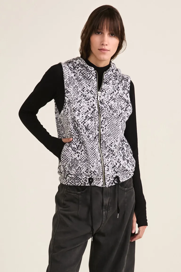 Chaleco sin mangas con capucha, diseño con cierre frontal y ajuste de cordón en el ruedo. Presenta bolsillos laterales funcionales y un calce versátil ideal para combinar en capas. Una prenda práctica para complementar conjuntos urbanos.