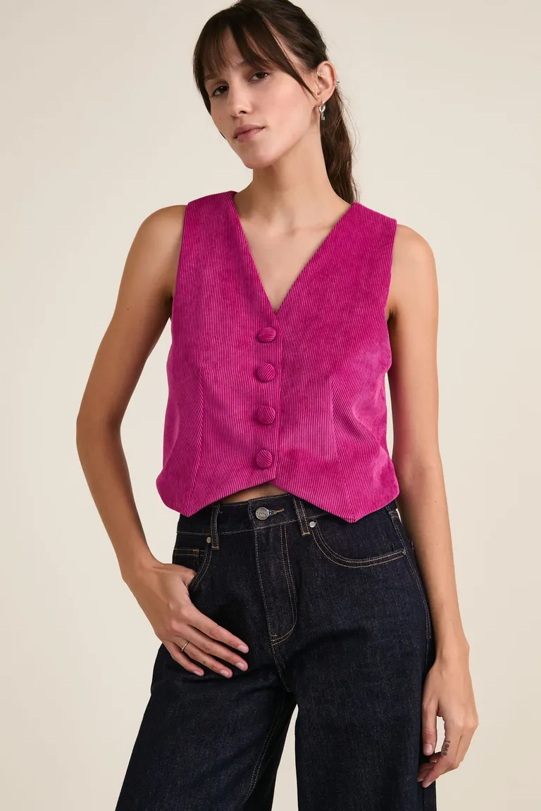Chaleco sin mangas con escote en V y cierre frontal mediante botones forrados. Presenta un diseño entallado con pinzas que estilizan la silueta, ideal para combinar en looks casuales o formales. Esta prenda aporta un toque de tendencia a cualquier conjunto diario.