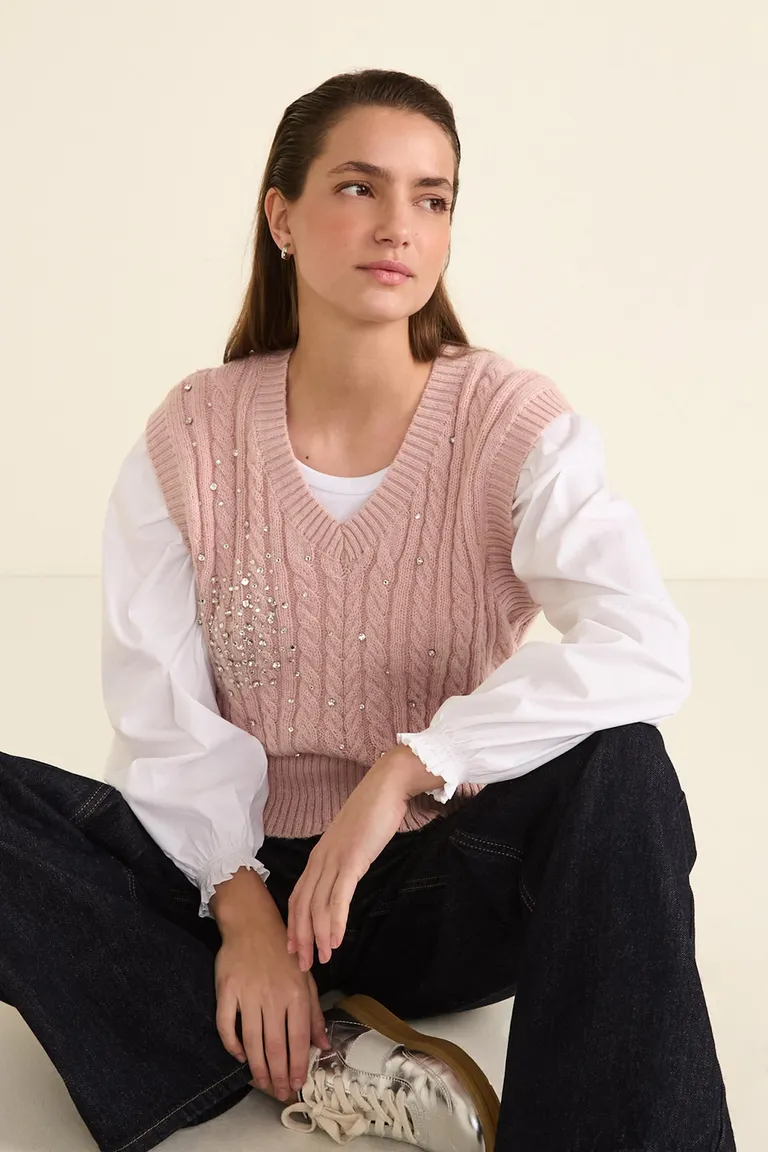 Chaleco tejido con diseño de trenzas y relieve, presenta escote en V y terminaciones en punto rib. Incluye detalle de strass en el frente, ideal para complementar conjuntos urbanos con estilo y textura. Prenda cómoda y versátil con corte clásico para un look casual y femenino en toda ocasión.