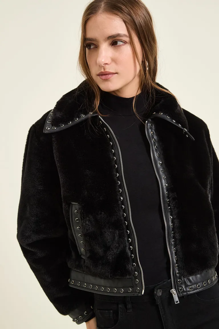 Chaqueta corta con cuello tipo camisero, diseñada con textura suave y detalles de tachas decorativas. Incluye cierre metálico frontal y bolsillos laterales, ideal para completar outfits urbanos durante los meses más fríos. Su estilo versátil permite combinarla fácilmente tanto para eventos formales como informales, destacando por su diseño distintivo y moderno que aporta personalidad a cualquier look.