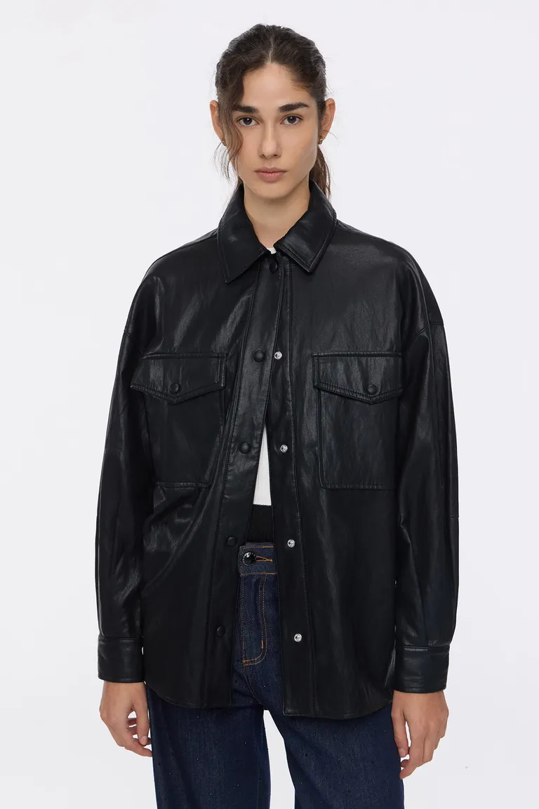 Chaqueta tipo camisa con diseño de corte holgado y cierre frontal mediante botones a presión. Cuenta con bolsillos funcionales en el frente, brindando un estilo versátil y moderno para completar cualquier conjunto casual o urbano. Ideal para combinar sobre prendas básicas durante los días de entretiempo.