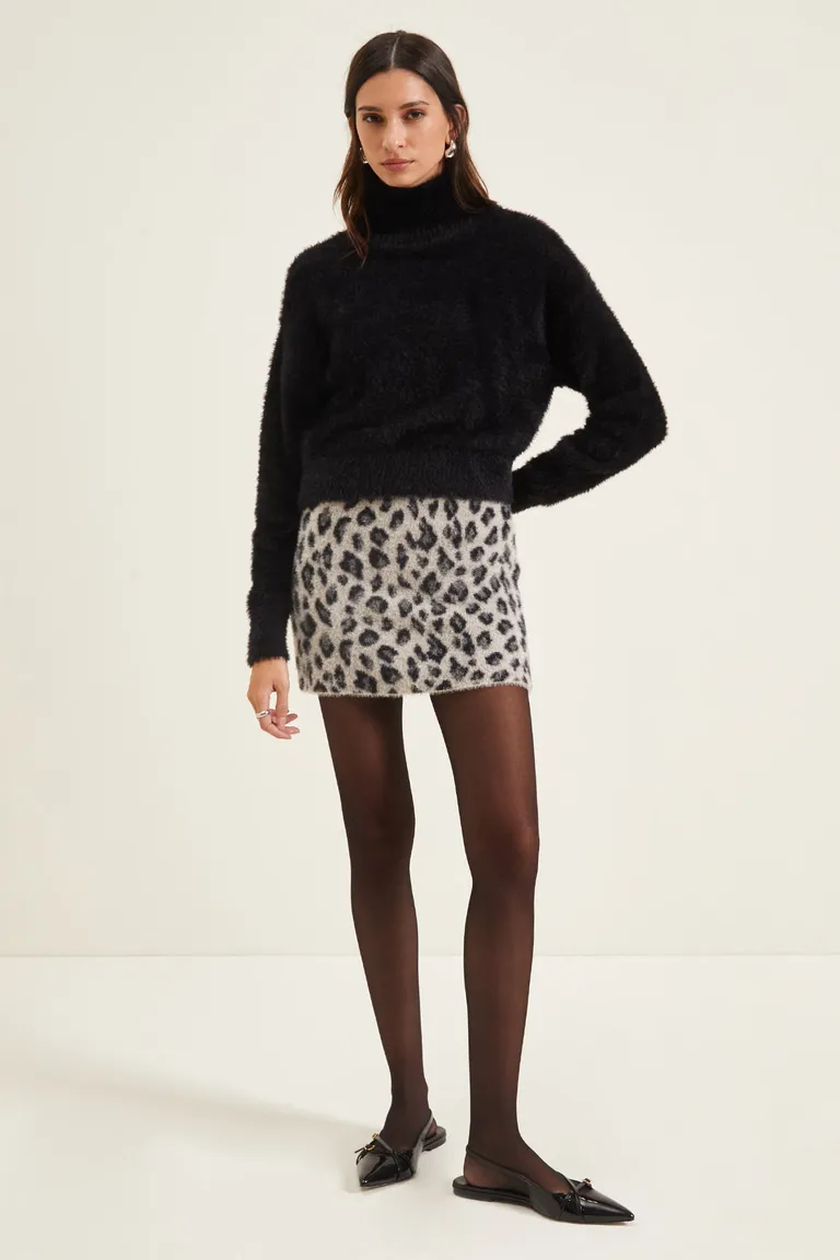 Falda corta de calce ajustado con diseño de estampado animal. Esta prenda presenta una textura con relieve ideal para combinar en equipos casuales o de noche. Un básico de temporada con diseño clásico.
