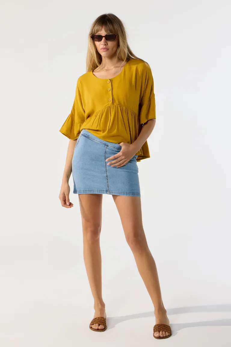Falda corta de denim con diseño clásico y calce ajustado. Presenta un lavado estilo acid wash que aporta textura, junto con costuras a contratono y bolsillos frontales. Incluye cierre lateral para un ajuste cómodo y funcional. Ideal para combinar en outfits casuales de uso diario.