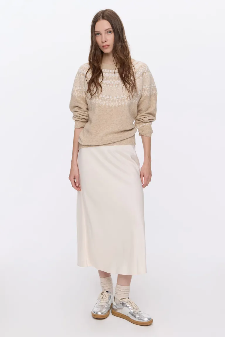 Falda midi con caída fluida y cintura elastizada, diseñada para brindar comodidad y versatilidad en cualquier ocasión. Esta prenda esencial de corte recto se adapta fácilmente a diferentes estilos, permitiendo crear looks tanto casuales como formales. Su diseño minimalista y elegante la convierte en una opción práctica para el uso diario, asegurando un ajuste cómodo y favorecedor en todas las tallas.