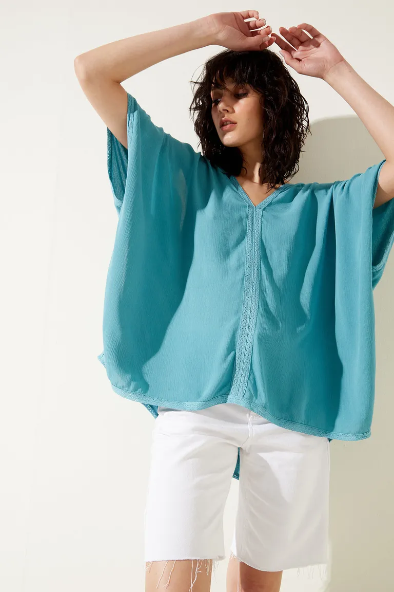 Kimono de diseño liviano con escote en V y mangas cortas. Presenta un detalle de entredós central y tajos en los laterales que aportan movimiento. Una prenda versátil, ideal para sumar una capa fresca y estilizada a cualquier conjunto diario durante la temporada de primavera y verano.