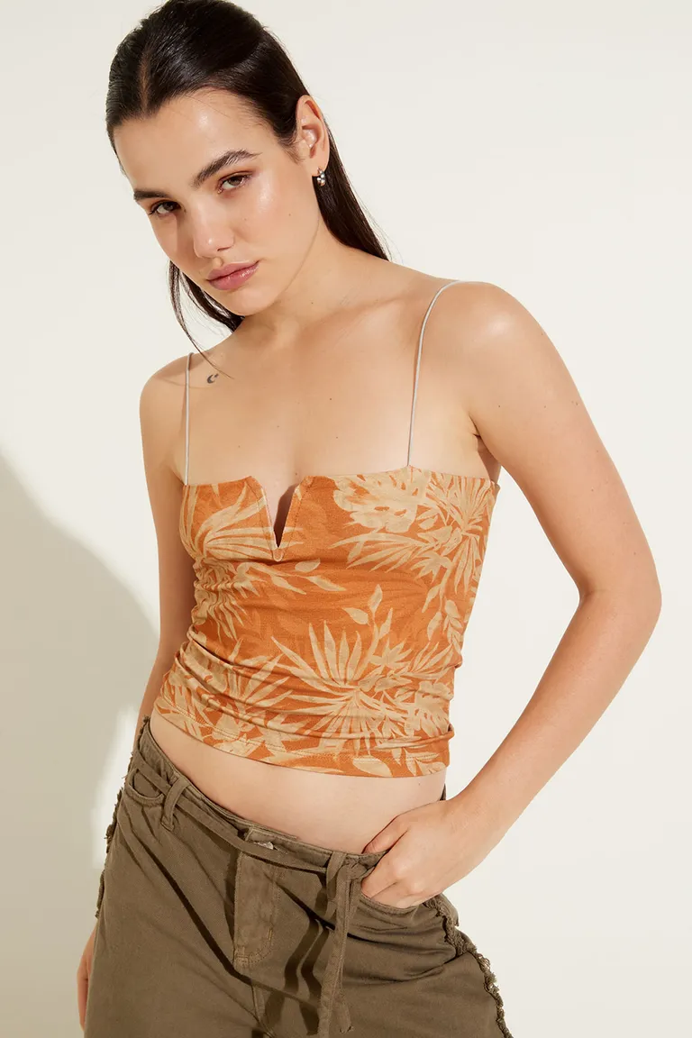 Musculosa ajustada al cuerpo con diseño estampado, escote recto con detalle de abertura en el centro y breteles finos. Ideal para completar looks casuales y urbanos en cualquier temporada, aportando un toque distintivo a tu estilo cotidiano.