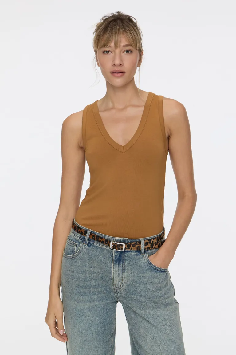 Musculosa de diseño clásico con escote en V pronunciado, ideal para completar tus conjuntos diarios. Una prenda versátil y cómoda para usar sola o debajo de otras piezas en cualquier estación del año.