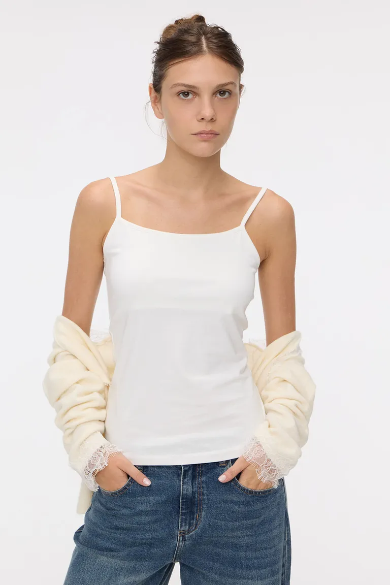 Musculosa de calce al cuerpo con breteles finos y escote recto. Una prenda básica y esencial, ideal para usar sola o como base de diferentes capas en looks cotidianos.