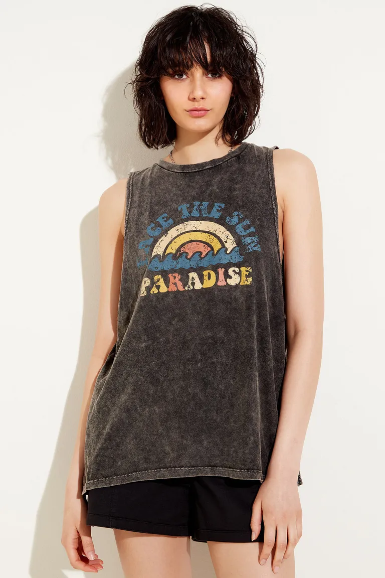 Musculosa de calce holgado con cuello redondo y diseño gráfico estampado en el frente. Presenta un acabado con efecto de lavado desgastado, brindando un estilo relajado y casual. Ideal para completar outfits urbanos y versátiles durante el día.