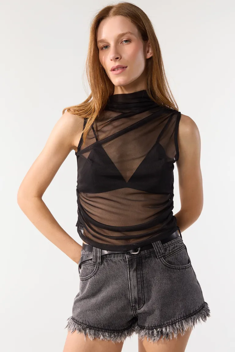 Musculosa confeccionada en microtul con diseño de cuello media polera. Presenta detalles de frunces en los laterales, aportando textura y dinamismo a la prenda. Una opción versátil y moderna para combinar en diversos outfits diarios.