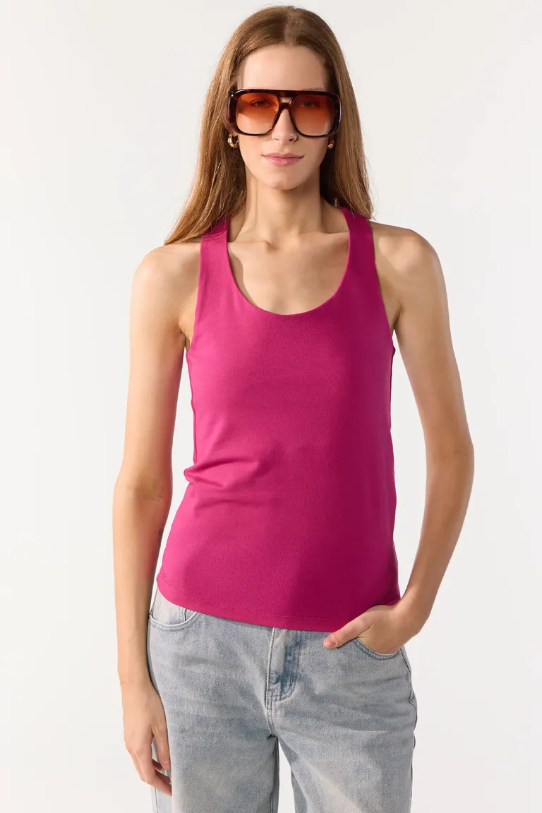 Musculosa de calce al cuerpo con escote curvo y diseño de espalda deportiva. Una prenda versátil y cómoda, ideal para completar outfits casuales o urbanos en cualquier temporada.