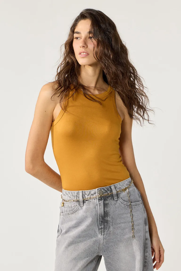 Descubre la elegante y versátil musculosa en jersey dorado con escote redondo y vivos anchos en las sisas. Perfecta para looks casuales y de oficina, esta prenda se adapta a cualquier ocasión y complementa tu estilo personal.