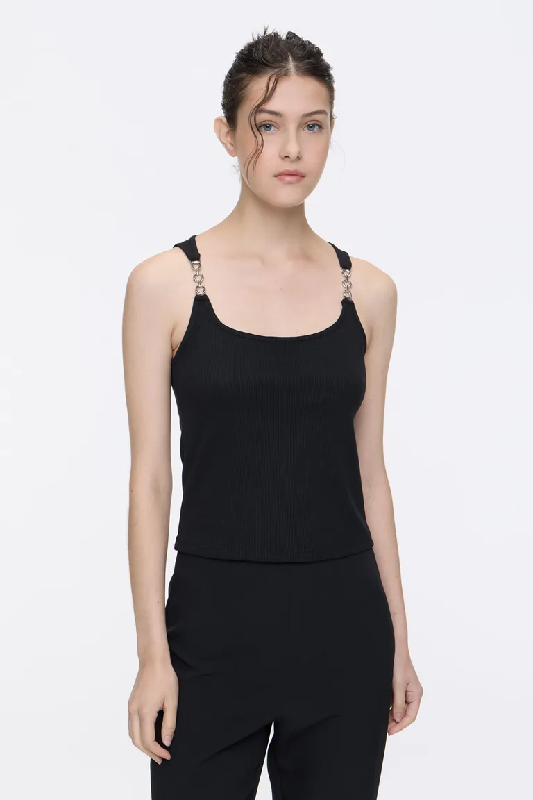 Musculosa de calce entallado con cuello redondo. Presenta un diseño minimalista con detalle de hebillas metálicas en los breteles, aportando un toque distintivo. Ideal para completar outfits casuales o elegantes durante todo el año.