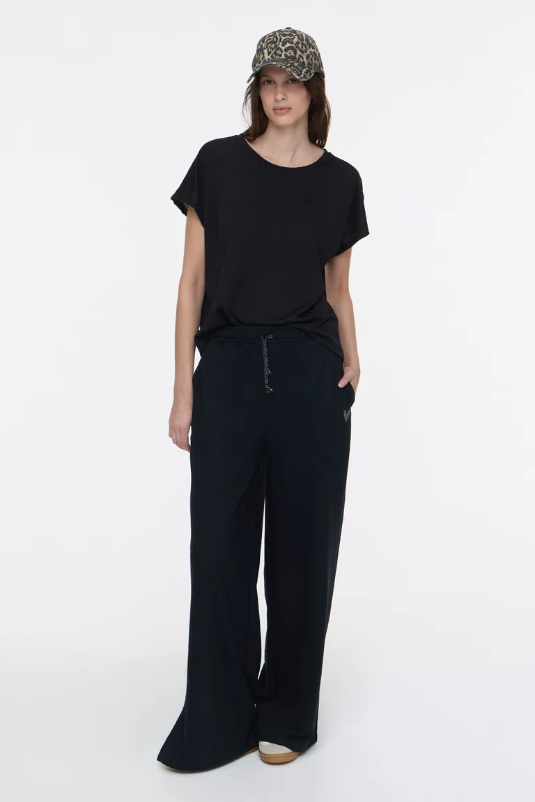 Pantalón de corte amplio y relajado, ideal para un look casual diario. Presenta una cintura elastizada con cordón ajustable para mayor comodidad y un detalle de tajo en el ruedo. Cuenta con bolsillos laterales y un pequeño bordado distintivo. Una prenda versátil y cómoda para combinar con diversas opciones de calzado y remeras.