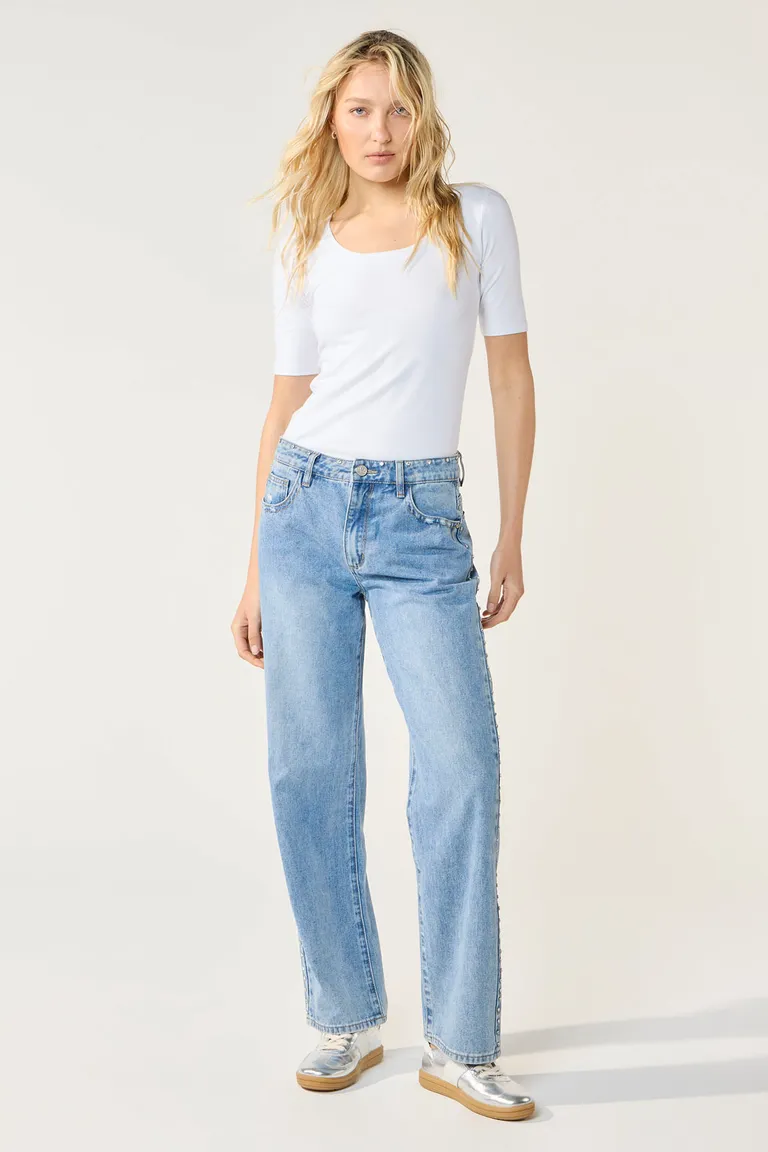 Estos pantalones de denim rectos de corte medio ofrecen un estilo clásico y versátil, ideal para combinar con diferentes prendas y crear looks casuales o más elegantes. Su lavado claro y detalle de aplicaciones con strass le dan un toque de sofisticación.